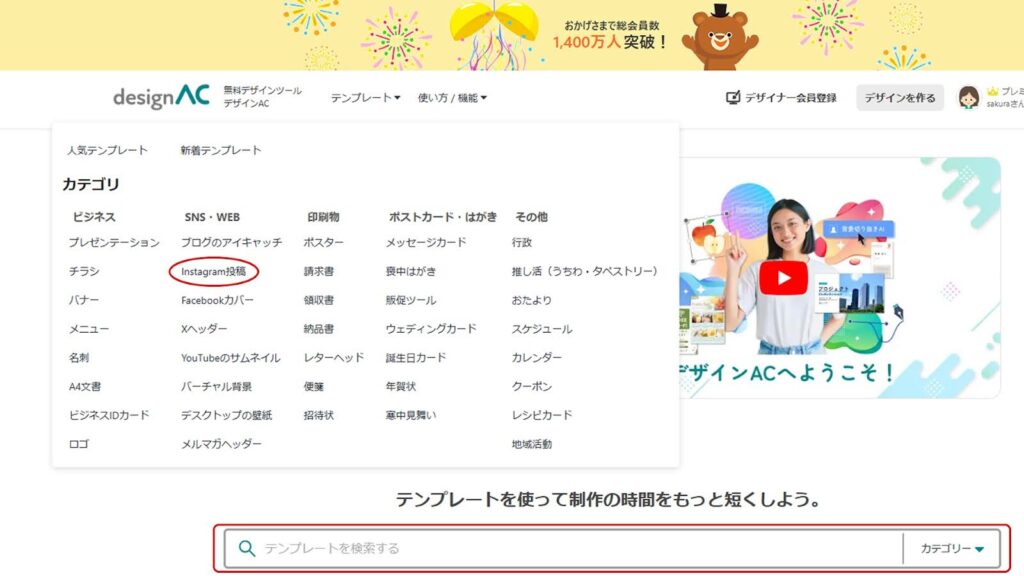 画面左上「テンプレート」をクリックするとさまざまなカテゴリーが表示されますので、「Instagram 投稿」を選択します。