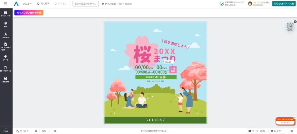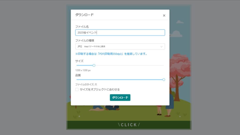 デザインが完成したら、画面右上の「ダウンロード・共有」ボタンをクリックします。ファイル形式は、JPGまたはPNGを選択し保存しましょう。