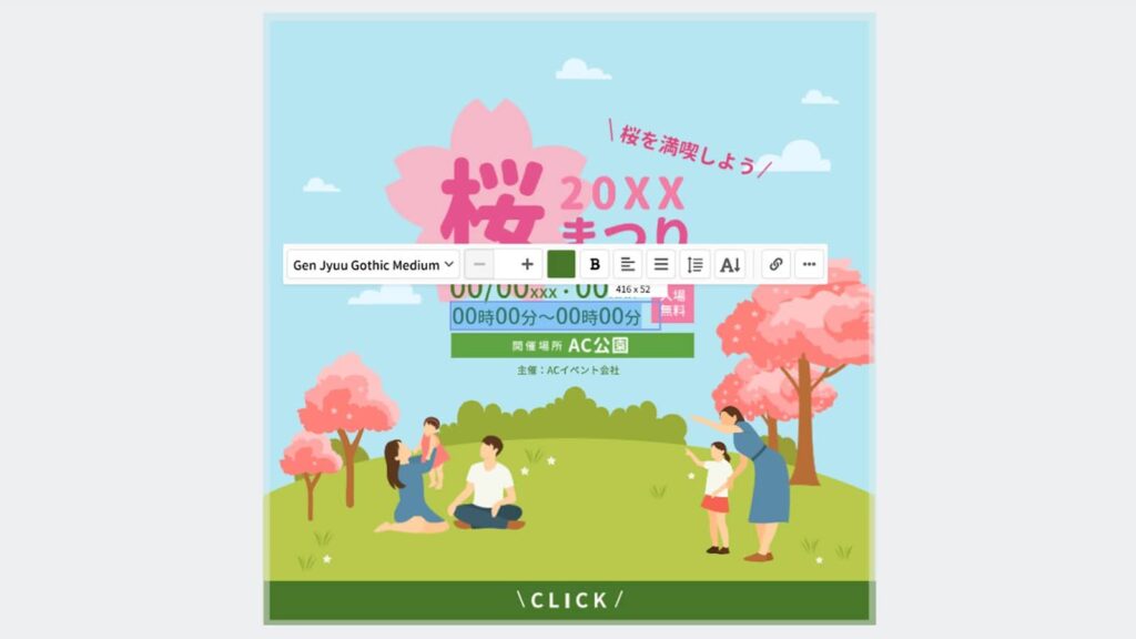 画面上部のツールバーを使って文字の色やフォントも自由に調整できますので、ブランドカラーや好みに合わせて、全体の統一感を高めましょう。