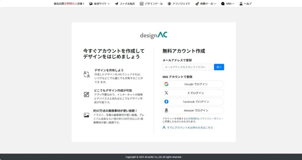 ユーザー登録(無料)すれば、デザインACはもちろん、写真ACやイラストACなど、豊富な素材がそろった姉妹サイトも利用できるため、とても便利!