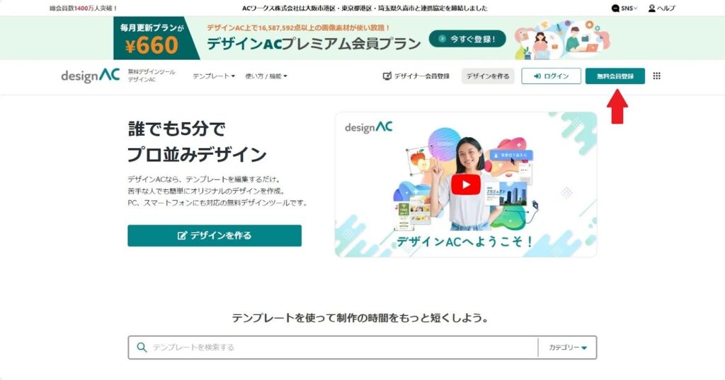 ユーザー登録を行うには、デザインACにアクセスし、右上にある「無料会員登録」を選択します。